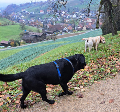 Eigentlich wollte ich mit dem Kauf des Rüden aus der Ukraine einer Labizüchterin helfen. Das gelang. Aber was nachher kam, konnte ich nicht abschätzen. Weil der Tollwuttiter zu niedrig war, musste ich Jack in "Einzelhaft" halten. 100 Tage Heimquarantäne! Das hiess, Sally in den unteren Stock verbannen, jegliche Hundekontakte waren verboten, genauso wie unnötiger Besuch von Menschen, alle 2 Wochen musste ich Jack beim Tierarzt vorstellen zwecks Berichts ans Vet-Amt. All dies hat Jack zusammen mit mir gut hinbekommen. Ich war jeden Tag sicher 4x unterwegs, und legte jeden Tag im Schnitt ca. 10km zurück. Der Hundetrainer gab uns sporadisch Einzelunterricht, jeweils nur eine halbe Stunde. Jack ist mit viel Arbeit zu einem starken, grossen Rüden herangewachsen. Er ist ein ganz wunderbarer Kerl. Nun kommt das wahre Leben. Hier finden Sie Bilder von Jack